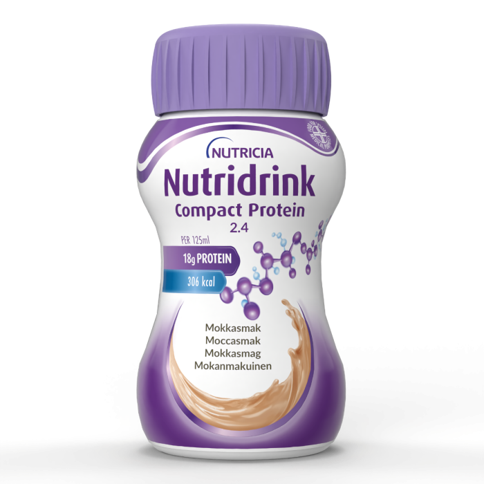 Nutridrink Compact Protein mokka on erittäin runsaasti energiaa ja proteiinia sisältävä täydennysravintovalmiste. Pakattu pieneen 125ml pulloon, jonka jaksaa juoda kerralla, vaikka ruokahalu olisi huono. 125 ml sisältää energiaa 300 kcal, proteiineja 18 g ja kuituja 0g.