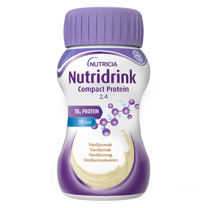 Nutridrink Compact Protein vanilja on erittäin runsaasti energiaa ja proteiinia sisältävä täydennysravintovalmiste. Pakattu pieneen 125ml pulloon, jonka jaksaa juoda kerralla, vaikka ruokahalu olisi huono. 125 ml sisältää energiaa 300 kcal, proteiineja 18 g ja kuituja 0g.
